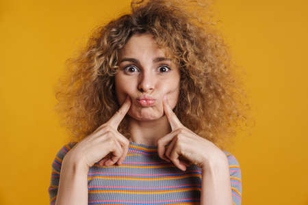 Young blonde woman with fizzy hair wearing casual clothes grimacing standing over yellow background, touching face