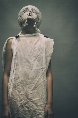 Scary Halloween. Horor. young girl in a strange suit. The face is covered with bound threads. Head up