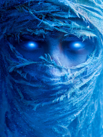 An enigmatic silhouette draped in shimmering icy veils, with piercing luminous eyes that cast an otherworldly glow against a frosty backdrop.
