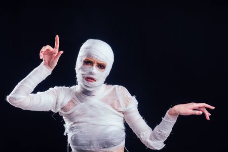 Glamorous mummy woman in bandages all over her body studio black background