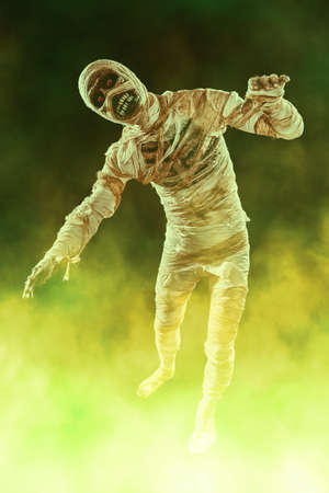 Full length portrait of a scary evil mummy on a dark background with mystical haze. Halloween. Ancient Egyptian mythology.