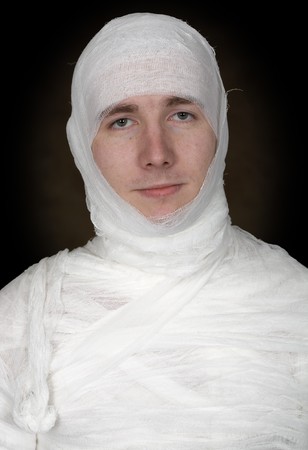 Studio image of a young man bandaged, on black background. Concept for health-care or ancient mummy