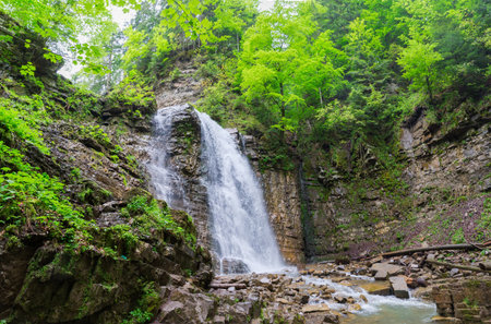 Maniava waterfall falling from a precipitous cliff ledge in form of a cirque with layered rock structure at the end of narrow mountain gorge at spring overcast day in Ukrainian Carpathians