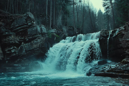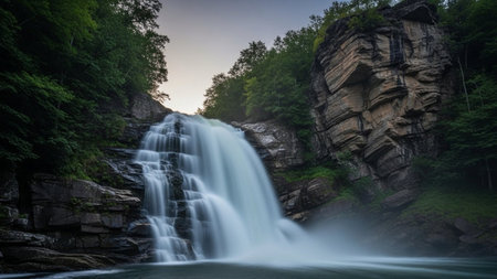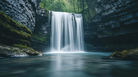 Majestic waterfall cascading down rocky cliffs surrounded by lush green forest, creating a serene and natural landscape full of movement and freshness.