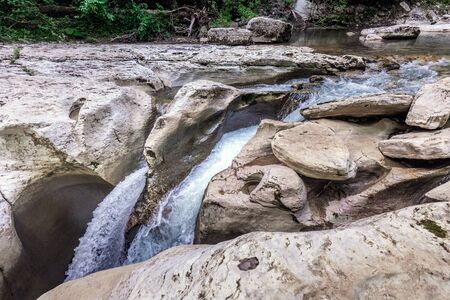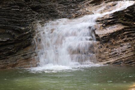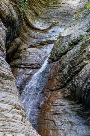 A scenic stream of a waterfall falling among a rocky gorge on the Agur river. Sheer cliffs among lush bushes and trees. Khosta microdistrict, Russia. Travelling, hiking and recreation in mountains.