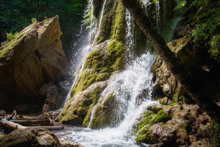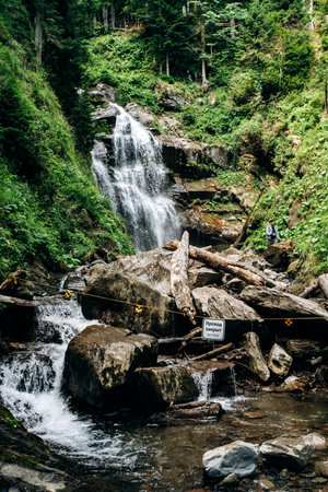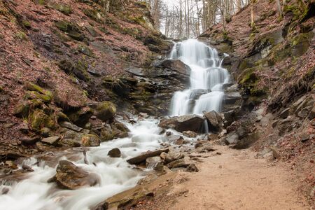 Guk Falls breaks through rocks in Carpathians mountains. Travel concept.