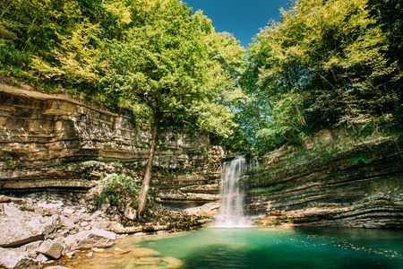 A high waterfall falls from a cliff into a clear lake. The waterfall is surrounded by green forest. Large stones on the lake. Blue clear sky. River Agura, Sochi, Russia
