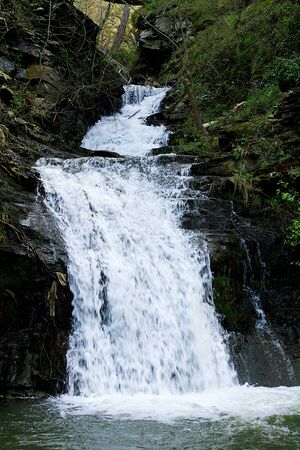 Forest river cascade waterfall. Shepot falls, Carpathians