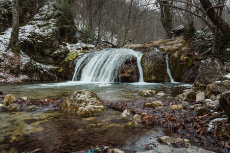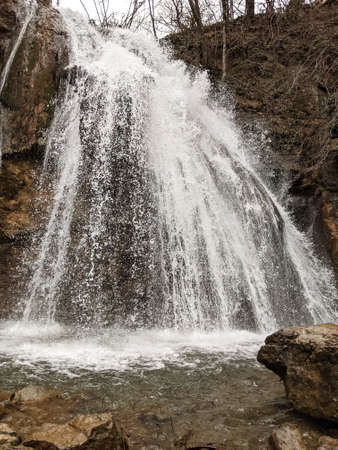 Cascades of Djur-Djur waterfall on Ulu-Uzen river in early spring with snow. Khapkhalskiy canyon in Crimea