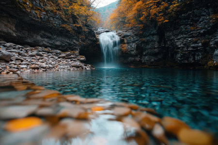 Long exposure view of the beautiful Pruncea Casoca Waterfall with fallen leaves in an autumn landscape,Siriu, Buzau, Romania