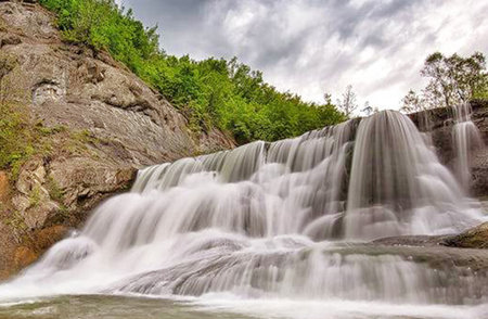 Waterfall in the forest on a cloudy day. Beautiful summer landscape.