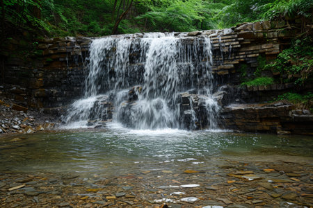 Natural waterfall cascading down rocky cliff surrounded by lush green forest, clear flowing water, peaceful outdoor landscape with vibrant foliage and tranquil atmosphere.