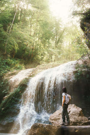 Woman tourist with a backpack walks next to the waterfall.