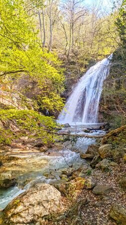 A beautiful waterfall deep in the tropical forest, steep mountain adventure in the rainforest. waterfall silver stream after the collapse of the visor, Crimea, Russia