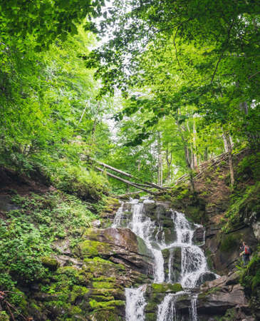 Waterfall Shypit or Whisper on river Pylypets in Carpathian Mountains, Ukraine. Ukrainian summer forest landscape with water stream, moss on cascade rocks and wild nature, natural seasonal background