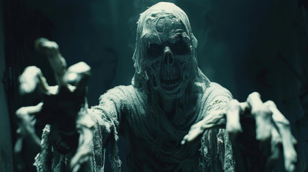 A ghastly zombie ghost with skeletal hands reaching out from the shadows