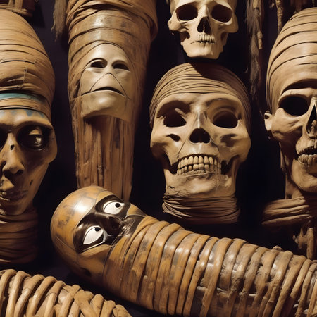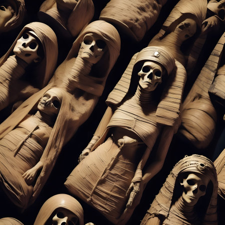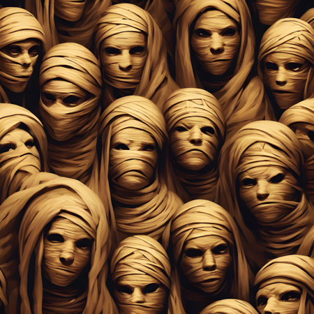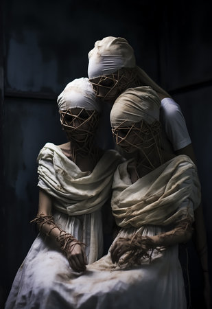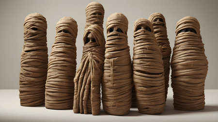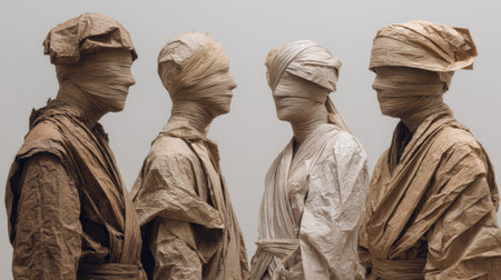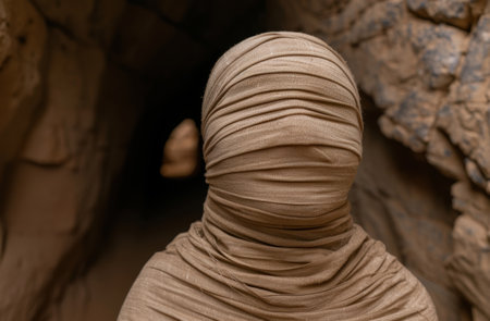 A detailed close-up depicts an ancient Egyptian mummy sculpture wrapped in layers of cloth. The portrait showcases the weathered texture of the bandages and the subtle shading that defines the form. This artistic composition could be utilized for historical studies or creative design projects.