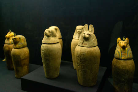 Cairo, Egypt - December 8, 2018: Canopic jars in Museum of Egyptian Antiquities, used by ancient Egyptians during mummification process to store and preserve viscera of their owner for afterlife