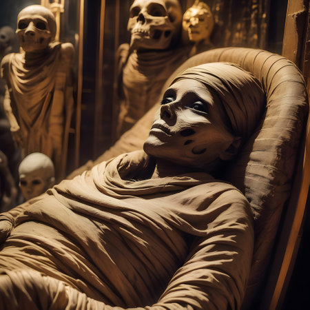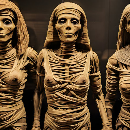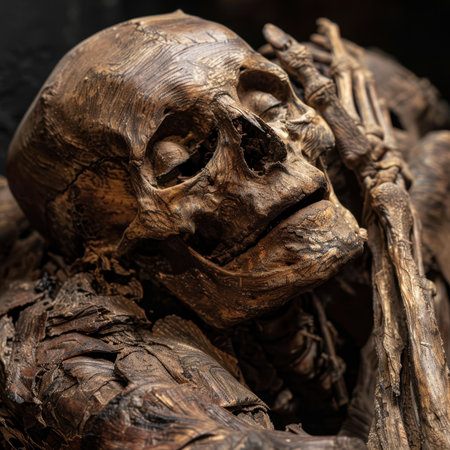 Ancient egyptian mummy displayed in dimly lit museum exhibit