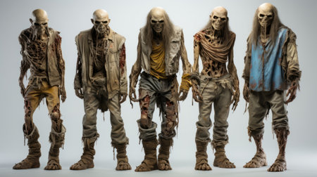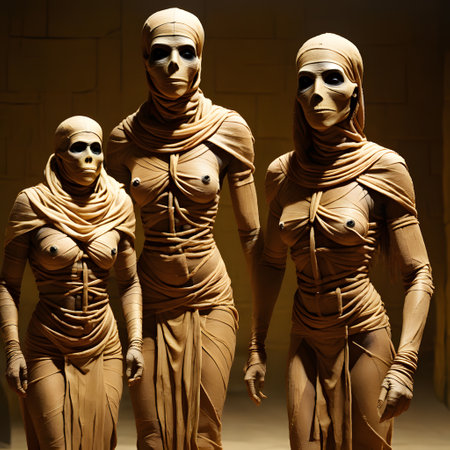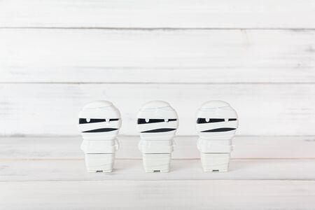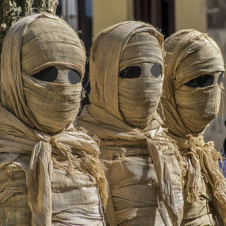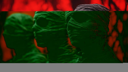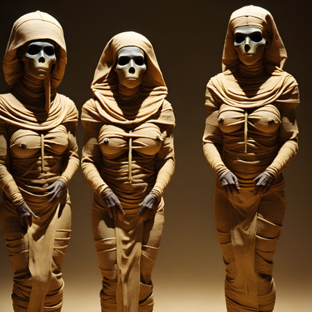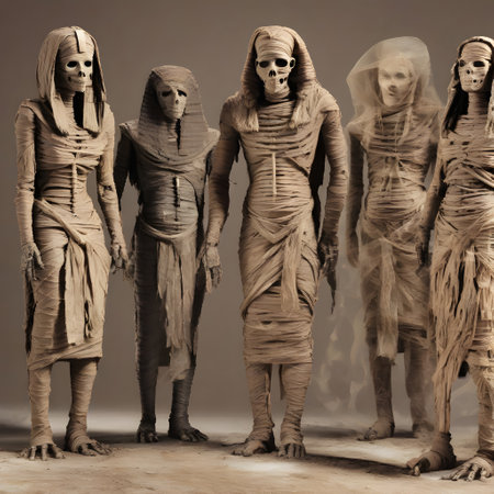 Three characters are entirely covered in bandages, showcasing a classic mummy look for Halloween. Their hidden faces and intense eyes contribute to an eerie ambiance ideal for the celebration.