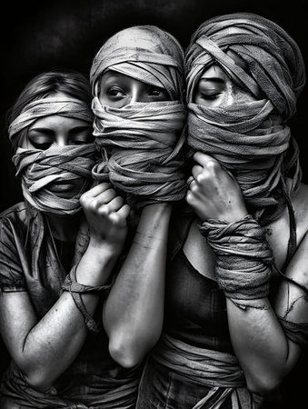 Black and white photo of women in bandages and dirty clothes in the form of slaves. AI generated, AI generative, AI generativ.