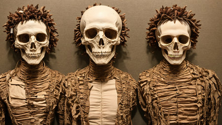 The three human skeletons wearing vintage white lace clothes. AI-generated.
