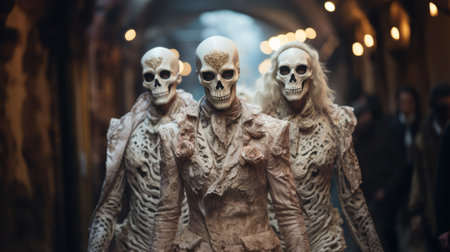 A Group Of Three Skeletons Dressed In Costumes. Generative AI