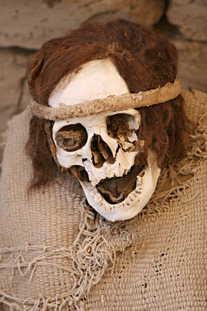 NAZCA, PERU - AUGUST 9, 2006: Trophy head with vegetal rope in the Museo Didactico Antonini.
