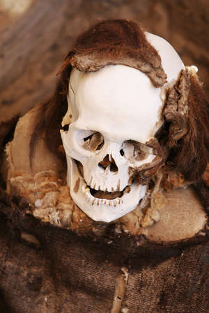 This pre-incan mummy is preserved by the dry desert air with hair intact. Skulls and bones in Chauchilla, an ancient cemetery in the desert of Nazca, Peru. The remains of many people, some still with long hair, can be seen.