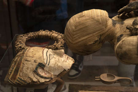 Turin, Italy - June 21th 2022: Exhibition of mummies, artifacts and Egyptian finds at the Egyptian Museum of Turin.
