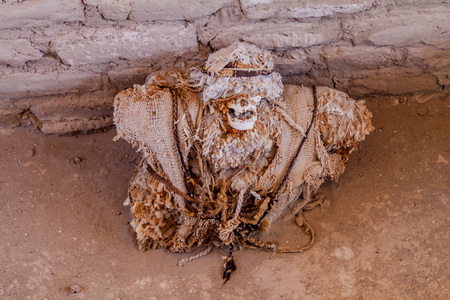 Preserved mummy in a tomb of Chauchilla cemetery in Nazca, Peru