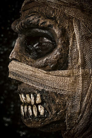 Close-up sideview portrait of a scary mummy on a black background. Halloween. Ancient Egyptian mythology.