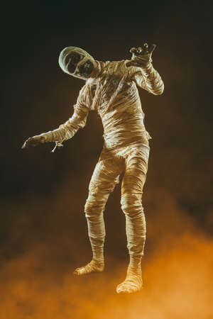 Full length portrait of a scary evil mummy on a dark background with mystical haze. Halloween. Ancient Egyptian mythology.