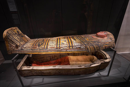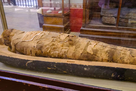 TURIN, ITALY - AUGUST 19, 2021: Egyptian sarcophagus with mummy, Egyptian Museum of Turin, Italy