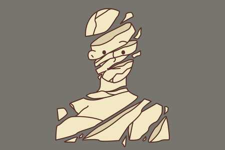 In a dimly lit space, a figure wrapped in white bandages stands boldly. The mysterious character exudes an air of intensity, evoking curiosity and tension. Shadows enhance the dramatic effect.