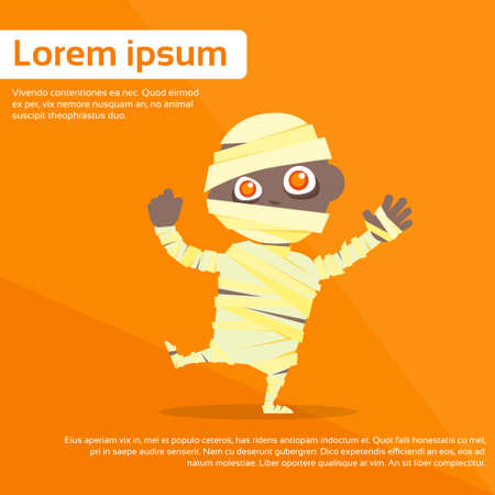 Boy dressed in mummy costume. Halloween holiday party. Vector illustration