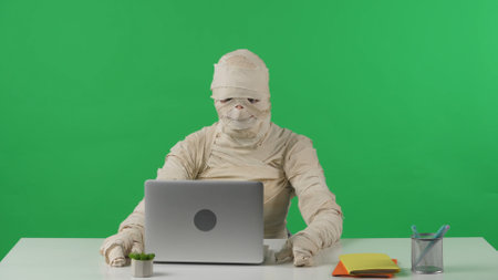 Green screen isolated chroma key photo capturing a mummy sitting at the table, in front of a laptop, typing, searching for something online.