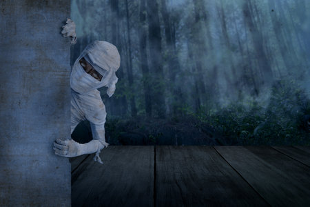 Mummy comes from behind the wall with a haunted forest background. Halloween concept