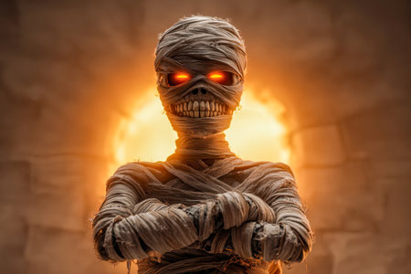 A daunting, centuries-old corpse shrouded in tattered wrappings, with piercing luminous eyes, looms boldly amidst a fiery orange backdrop, exuding an eerie, haunted aura.