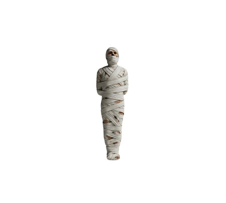 Ancient Egyptian mummy standing upright tightly wrapped in beige linen bandages isolated full body figure artifact.