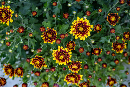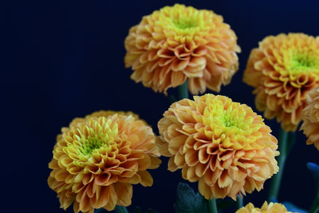 Yellow chrysanthemum flowers top view close-up with dark background. Colorful yellow and orange chrysanthemum flower bloom in the farm. Selective focus.