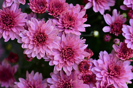 Small pink chrysanthemums or daisies grow in a flowerbed as a fluffy bush. Autumn beautiful background. Natural texture.