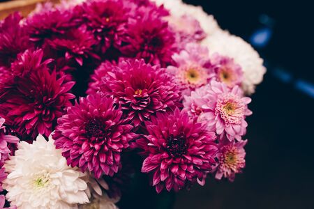 Chrysanthemum flowers close up as a beautiful autumn background. Fall theme concept backdrop. Selective focus
