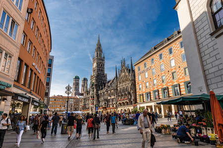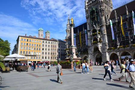 Tourists and locals walking in Marienplatz the Town square of Munich. On background the New Town Hall (Neue Rathaus) and the Cathedral. Bavaria, Germany.