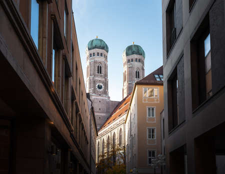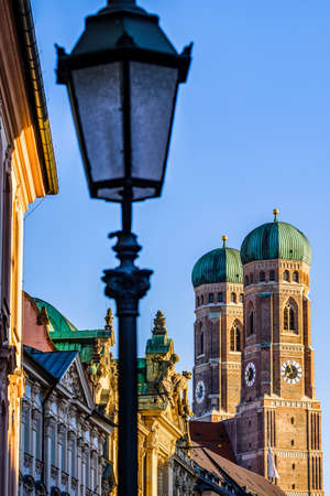 MUNICH, GERMANY - Feb 01, 2020: Amazing view at famous so called Frauenkirche. Gothic cathedral in downtown Munich, right next to Marienplatz. Tourist attraction.