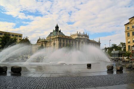Stachus fountain on Karlsplatz in Munich with view to the Palace of Justice, Bavaria, Germany
