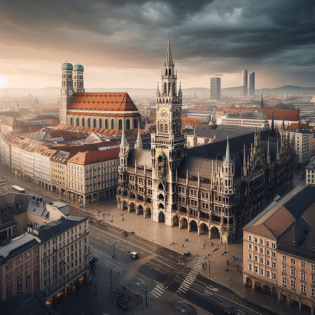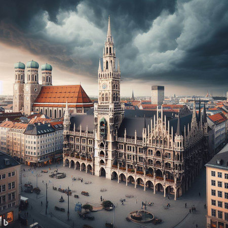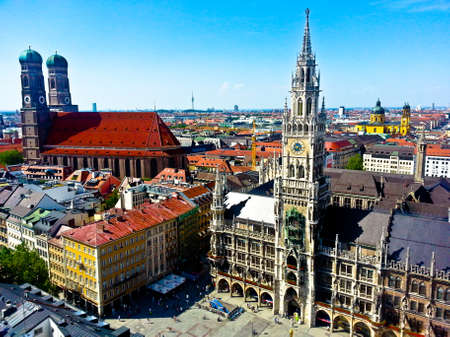 Panorama view of Munich city center showing the City Hall and the Frauenkirche