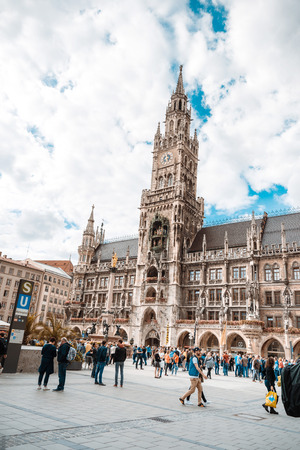 Marienplatz also called Mary's Square with the new city hall is one of the most vital places in Munich and unidentified people are walking along