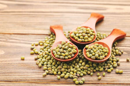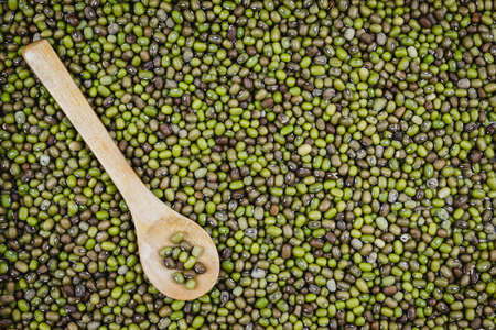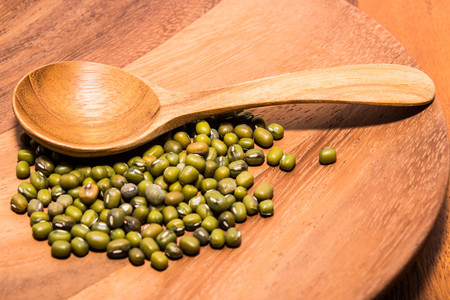 Wooden spoon and mung bean as the background.