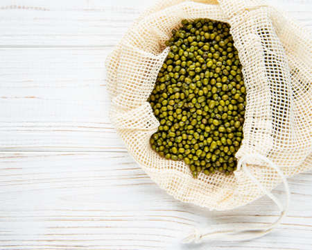Raw mung beans in the cotton bag on a old wooden background